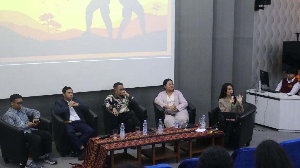 The activity took place offline in the Audio Visual Room, FISIP Unpar, with three defense industry practitioners present, namely Mr. Moh. Arif Faisal (Director of Commerce, Technology and Development – PT Dirgantara Indonesia), Mr. Samuel Zefanya (Export Sales Marketing Manager – PT Pindad), and Mr. Ikhfan Ammar Rangkuti (Technical Manager of Defense Satellite Project – PT Len Industri). The discussion also featured Mrs. Meyta Saraswaty Putri, a lecturer in International Relations at Unpar, who has professional experience as Head of Marketing Strategy for Aircraft and Aerostructures at PT Dirgantara Indonesia, as a resource person. Guided by Mrs. Ratih Indraswari as moderator, this discussion focused on discussing the relationship between global geopolitical dynamics, national defense industry governance, and Indonesia’s strategy in building technological independence through defense diplomacy instruments.
